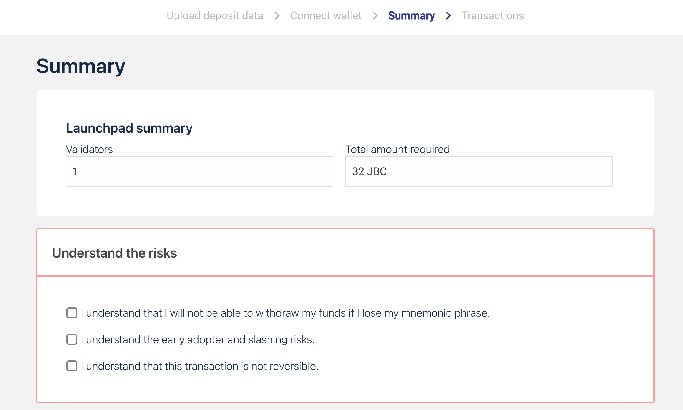 9. The summary page will be shown, recheck your validator information and understand/accept the risk