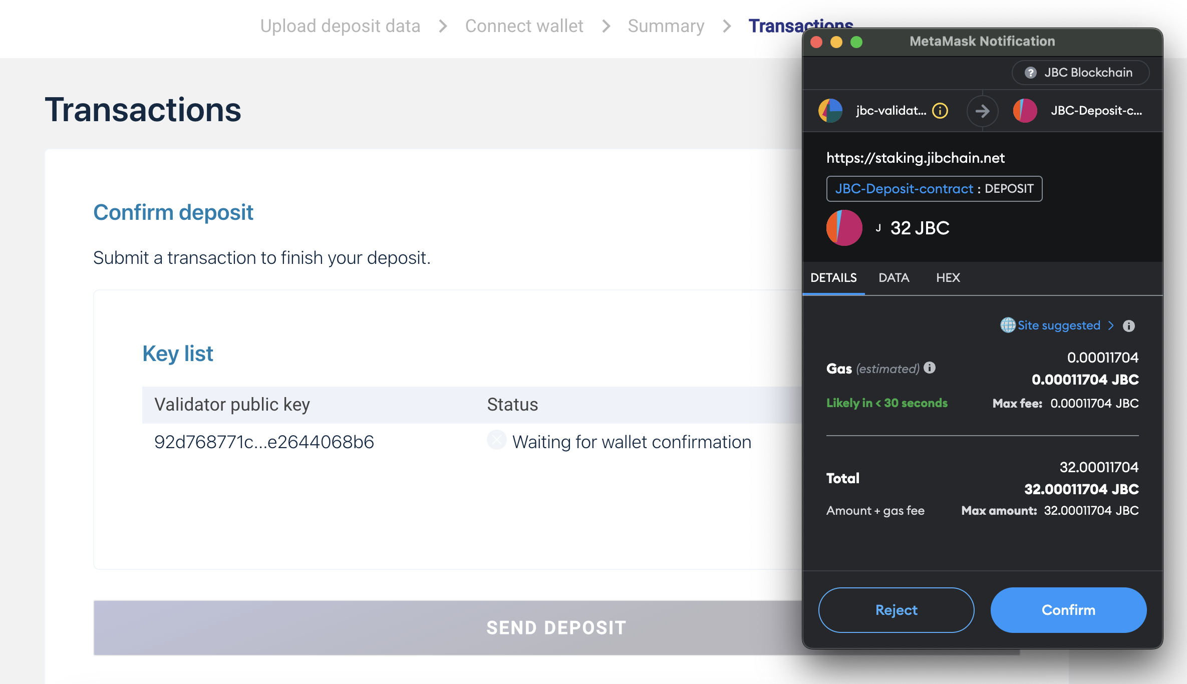 13. Check your transaction from Block Explorer on the JBC deposit contract: