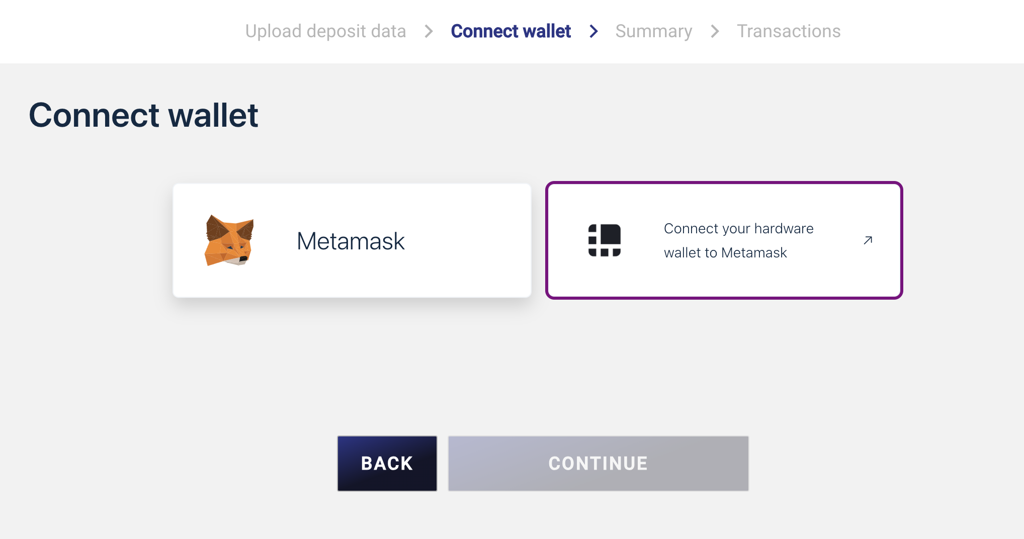 2. Upload the deposit data that you generated, Choose `deposit_data-*.json` NOT a `keystore` file.